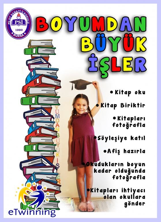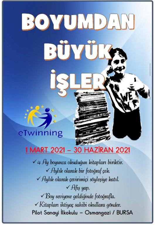 Okulumuz sınıf öğretmeni Rıdvan ARDA önderliğinde başlatılmış, çok değerli bir proje olan "Boyumdan Büyük İşler" e twinning projesi hayata geçirilmiş olup ülkemizin her yerinden bir çok katılımcının ilgisini çekmiştir. Bu poje kapsamında öğrencilerimiz hayatın her alanında kitap okuyarak okumaya karşı toplumsal duyarlılık ve motivasyon sağlayacak, küçük yaşta büyük deneyimler elde edecek, yaşam boyu öğrenmeyi öğrenecek. Yardımlaşmanın önemini uygulamalı olarak kavrayacaklar. "Boyumdan Büyük İşler" Projesine okulca katılım sağlanacak. Projemize il içi ve il dışından onlarca ortak başvurdu. Okul Proje Ekibi ile sürece hazırlanan arkadaşlarmıza başarılar dileriz.